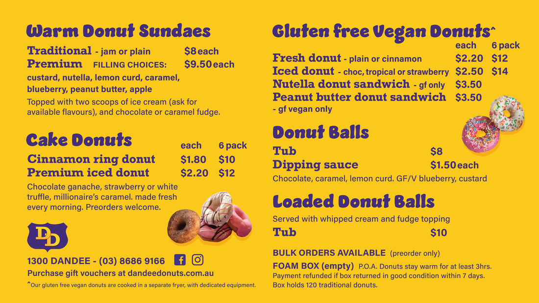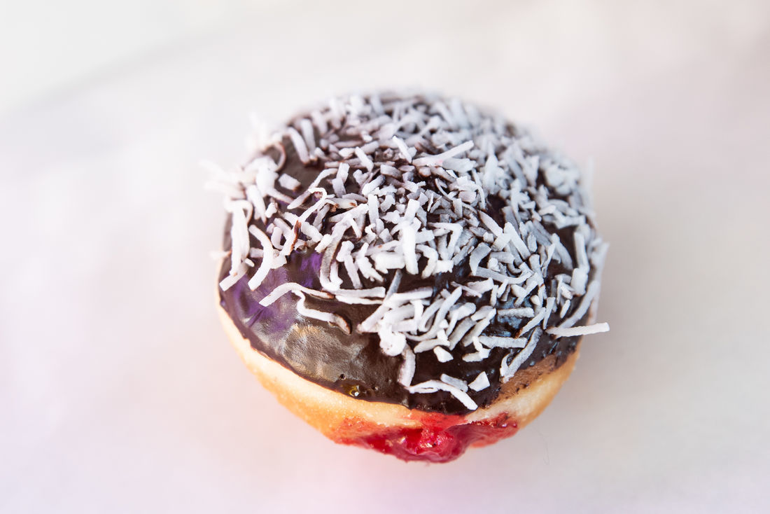 - Tim Tam Donut Burger (a donut sliced in half and layered with jam, a Tim tam, and whipped cream); and our Lamington Donut (hot jam donut with chocolate ganache and shredded coconut).