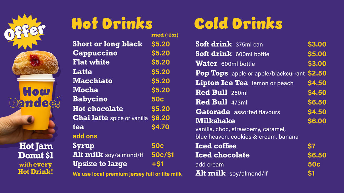 We sell great coffee, thanks to the amazing product from Seven Seeds Coffee. We have barista trained staff and we use the best jersey milk that we order in from a local dairy. This milk, whilst more expensive, provides a better froth than cheaper milk! We also have milk alternatives available including soy, almond and lactose free.