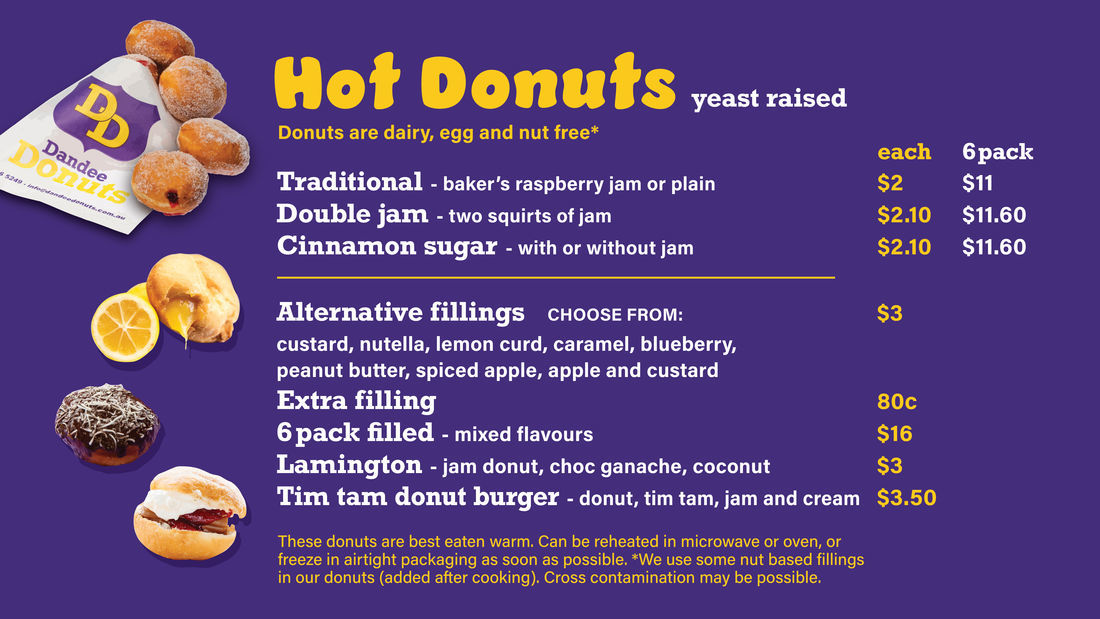 - Premium hot filled donuts - premium fillings in our traditional donuts. Our current includes Nutella, custard (dairy free) blueberry, lemon curd, caramel, peanut butter and apple.P